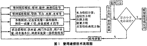 建立與實際管網(wǎng)系統(tǒng)特征相符的動態(tài)模型是優(yōu)化管理、優(yōu)化調(diào)度及優(yōu)化改(擴)建的基礎(chǔ),是診斷管網(wǎng)異常、提高管理水平的保證。建模技術(shù)流程見圖1[2]。